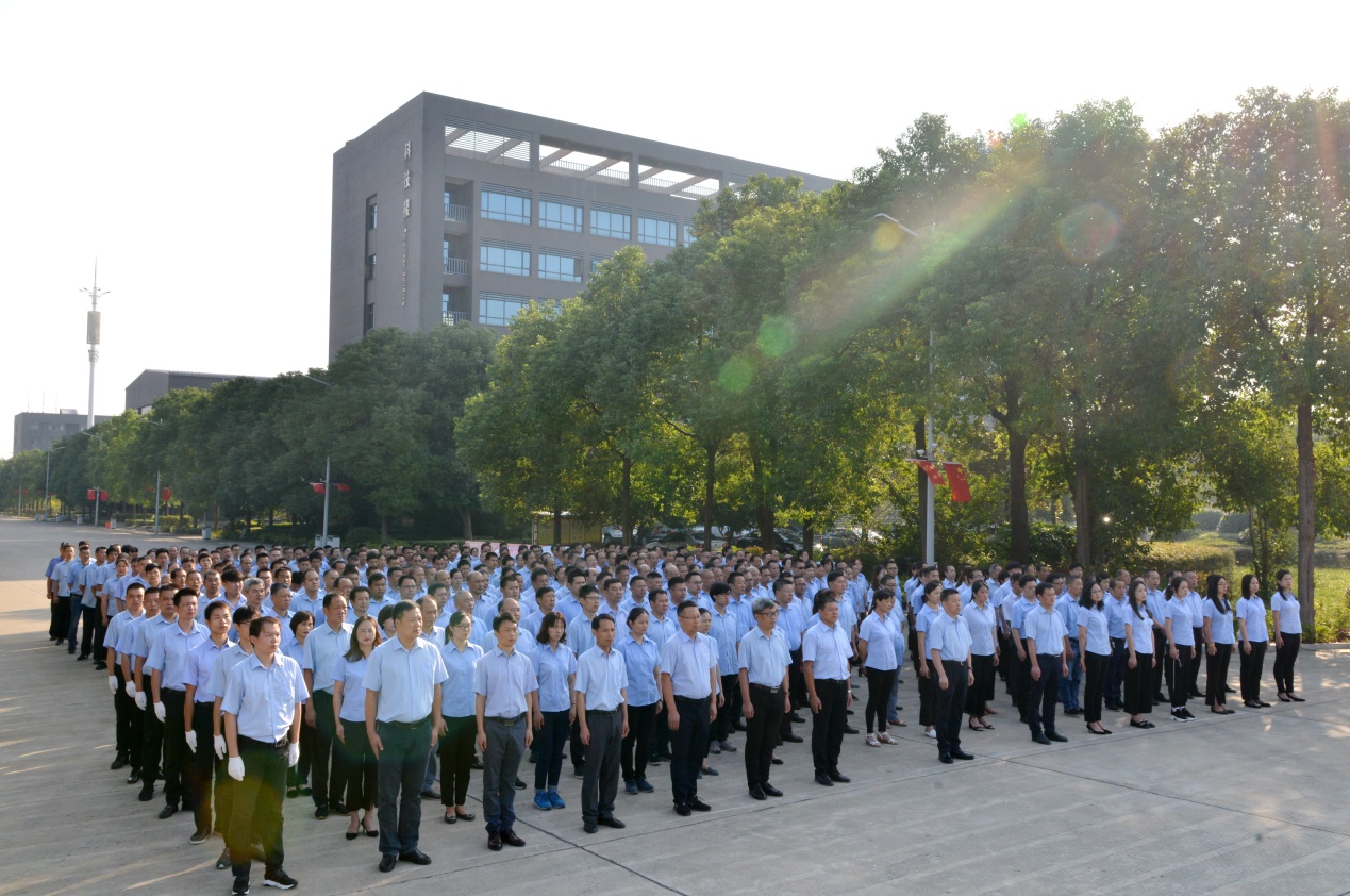8:20時,活動儀式在總經理焦倫進的主持下啟動,七名旗手邁正步從員工方隊繞過,直達旗壇,行進口令威武響亮。在主持人的指令下,三名旗手將一面鮮艷的五星紅旗在莊嚴的國歌聲中徐緩地升上天空,員工方隊注目國旗,唱起雄壯的國歌。