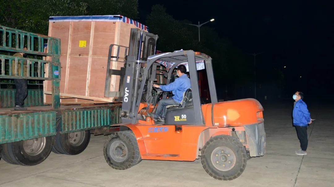 夜幕降臨,公司叉車司機姚順華抓緊時間將包裝好的產品進行裝車作業