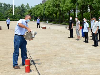 楊吉學在公司組織的消防演練中示范消防器材正確使用方式