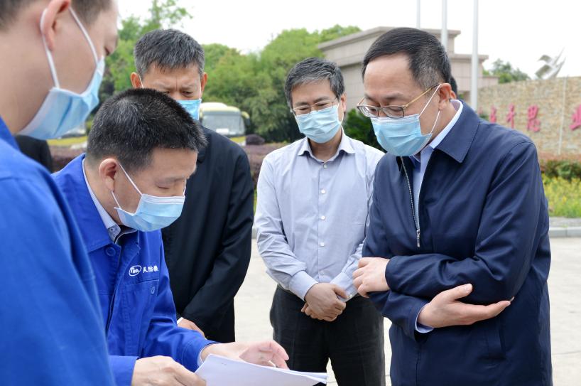 沈方勇董事長(zhǎng)向國家衛(wèi)健委副主任于學(xué)軍(右1),國家衛(wèi)健委衛(wèi)生應(yīng)急辦公室監(jiān)察專員張國新(右2)等領(lǐng)導(dǎo)匯報(bào)天門紡機(jī)復(fù)工復(fù)產(chǎn)疫情防控情況