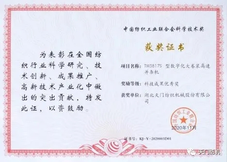 董事長代表公司獲評“2019中國紡織行業(yè)年度創(chuàng)新人物”。TM3817S型并條機獲評“紡織之光”2020年度中國紡織工業(yè)聯(lián)合會“科技成果優(yōu)秀獎”。鄭強、楊家軒、黃必廣、郭升旗、徐紅、譚鵬飛、沈忱等7名研發(fā)人員獲得個人“科技成果優(yōu)秀獎”。