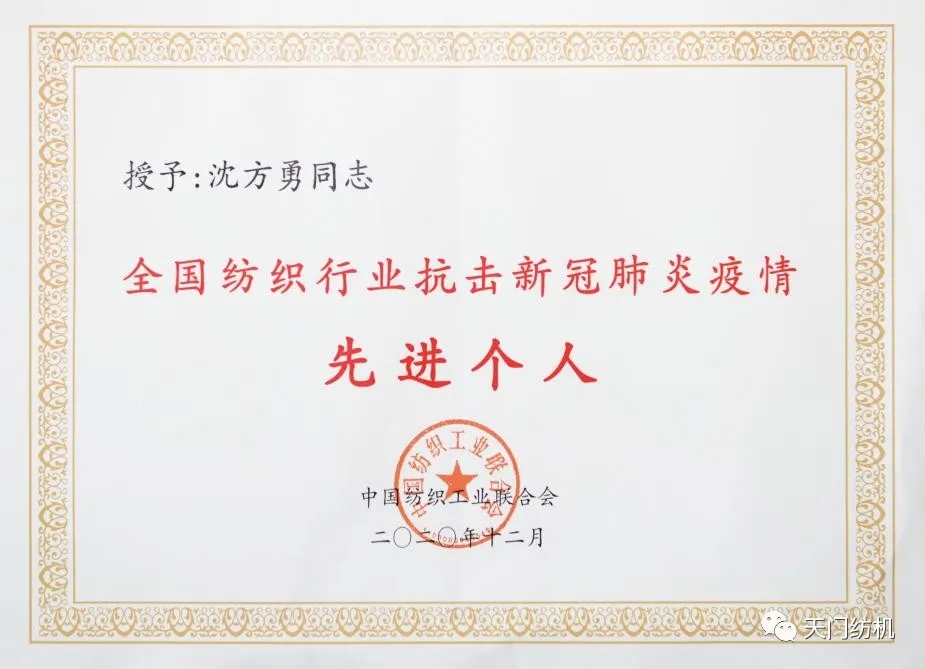 國家衛(wèi)建委、湖北省、天門市共11次檢查指導防疫工作,給予高度好評。國家衛(wèi)健委副主任于學軍評價天門紡機防疫有預案、有演練、有實踐,對企業(yè)抓防疫、保復產(chǎn)、促就業(yè)給予了充分肯定。9月,董事長獲評“全國紡織行業(yè)抗擊新冠肺炎疫情先進個人”、天門市“抗擊新冠肺炎疫情先進個人”,代表公司在疫情的大考中獲得時代新榮譽。