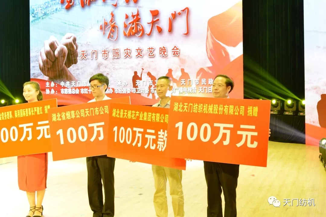 2016年,天門全市遭遇百年一遇的特大洪澇災(zāi)害,人民生命財(cái)產(chǎn)受到嚴(yán)重威脅。天門紡機(jī)積極參與政府組織的抗洪救災(zāi)慰問活動(dòng),為奮戰(zhàn)在一線的防汛抗災(zāi)人員送去食品、藥品和救災(zāi)物資,并捐贈(zèng)100萬元抗洪救災(zāi)款。