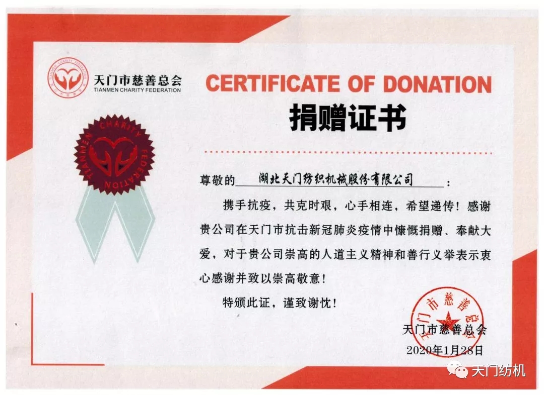2020年,面對(duì)來勢(shì)洶洶的新冠疫情,作為一家民營(yíng)企業(yè),天門紡機(jī)不計(jì)經(jīng)濟(jì)損失,率先提出了“不給黨和政府添麻煩,不給疫情防控添壓力,不給社會(huì)就業(yè)添負(fù)擔(dān)”,率先停產(chǎn)歇業(yè),率先捐贈(zèng)100萬元,專門用于收治新冠患者,采購(gòu)短缺醫(yī)療物資。公司管理層還通過多種渠道,主動(dòng)與有影響力基金會(huì)取得聯(lián)絡(luò),分6個(gè)批次向醫(yī)院、社區(qū)捐贈(zèng)了30萬只醫(yī)用口罩、10噸醫(yī)用消毒液、2萬件防護(hù)服等大量物資,在抗疫的危急時(shí)刻發(fā)揮了重要作用。