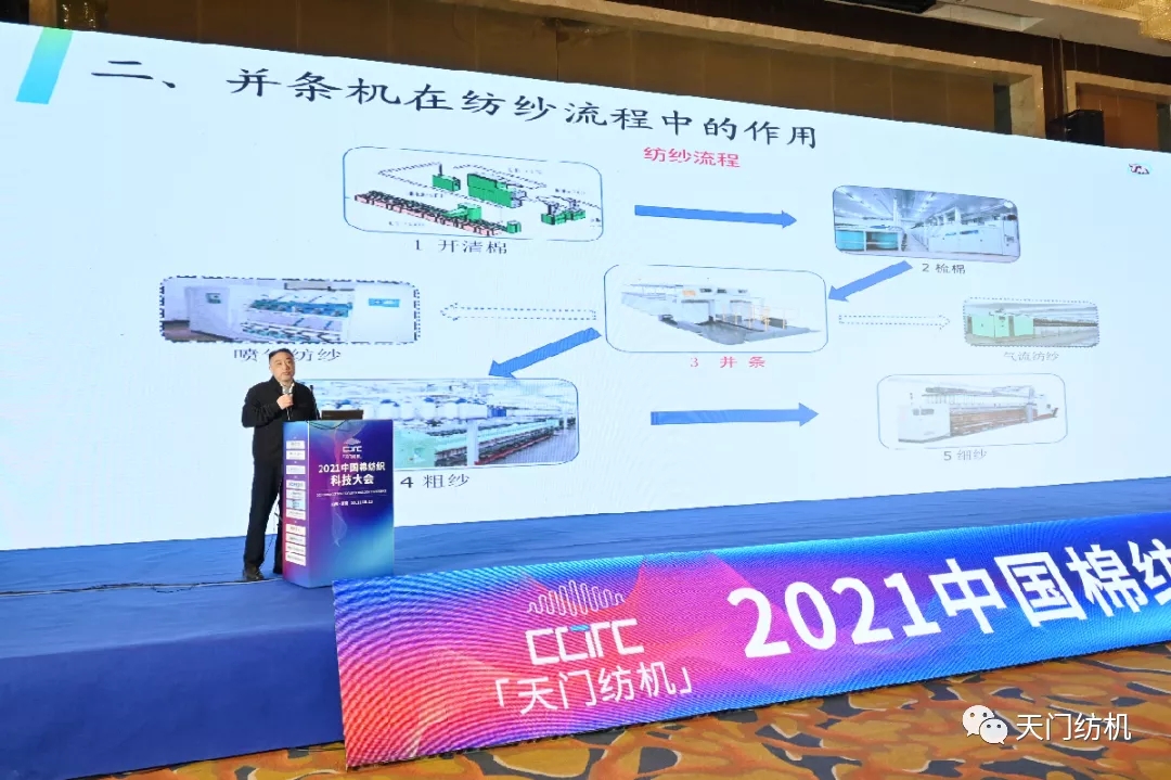 湖北天門(mén)紡織機(jī)械股份有限公司總經(jīng)理焦倫進(jìn)作了《并條機(jī)的創(chuàng)新與未來(lái)》的專(zhuān)題報(bào)告。在報(bào)告中,焦倫進(jìn)總經(jīng)理介紹了并條機(jī)在紡紗流程中的作用,并就目前紡織企業(yè)對(duì)并條機(jī)創(chuàng)新的要求,從傳動(dòng)結(jié)構(gòu)及精度、加壓系統(tǒng)、牽伸裝置、清潔系統(tǒng)、部件及提供設(shè)備的數(shù)字化、信息化、智能化水平等方面進(jìn)行介紹。最后,焦倫進(jìn)總經(jīng)理指出未來(lái)并條機(jī)將向著梳并聯(lián)合、并粗聯(lián)、短流程一體機(jī)在技術(shù)上的突破方向發(fā)展。